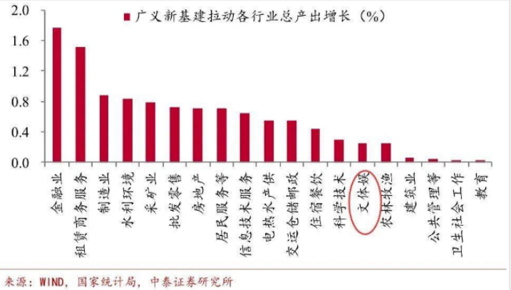 根据中泰证券研究测算,新基建一方面可以拉动文体娱乐行业产出增长0.4%左右(如图1);另一方面,5G、人工智能、工业互联网等新科技催生了云游戏、AR/VR、超高清、智慧文旅等新形态,提升了南京市文化产业的发展质量,实现了文化产业创新战略的转型,即将开启南京市发展文化产业迈向新时代的战略机遇期。