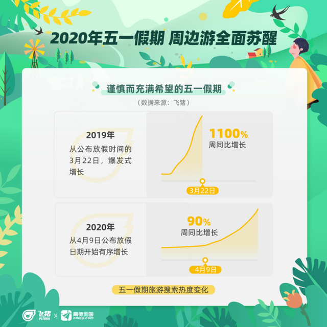 飞猪4月22日发布的数据也显示,近三周以来,五一旅游搜索持续以超90%的周增长率攀升。周边游将在五一全面苏醒,带动城市周边度假酒店价格恢复至旺季正常水平。