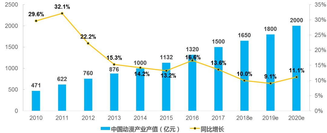 根据艾瑞咨询发布的《2018 年中国动漫行业研究报告》,中国动漫产业总产值已突破 1500 亿元,在线内容市场规模近 150 亿元。而用户规模也获得较大增长,泛二次元用户规模近 3.5 亿,在线动漫用户量达 2.19 亿。对比国外动漫产业已经发展较为成熟的国家,中国动漫产业市场需求现在已经十分庞大,但目前的动漫市场供应远远不足。中国动漫产业的产值规模相对于自己庞大的受众规模而言还有很大的增长空间。