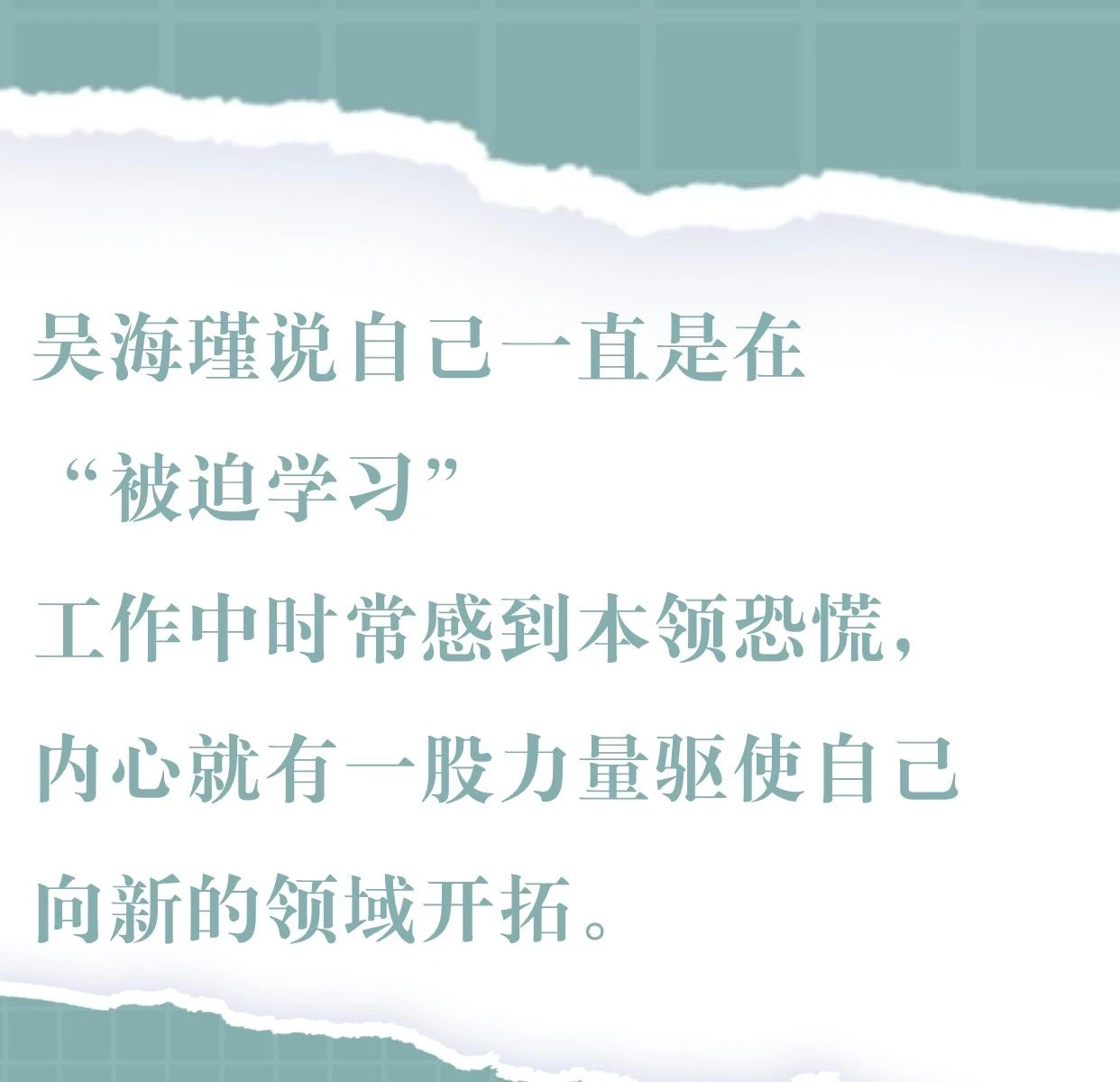 吴海瑾说自己一直是在“被迫学习”——工作中时常感到本领恐慌,内心就有一股力量驱使自己向新的领域开拓。