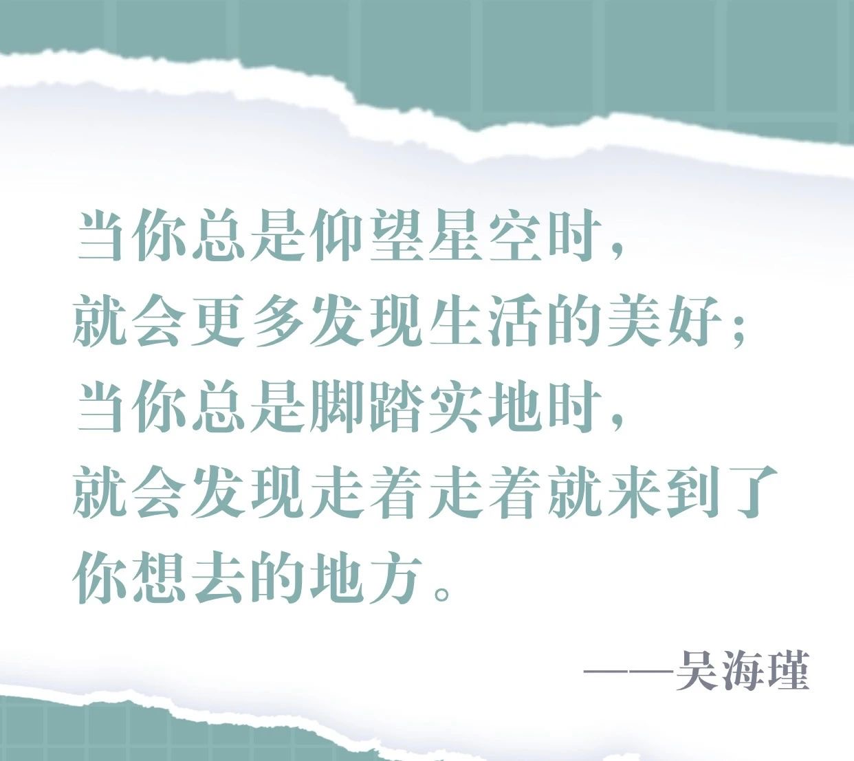 “所谓普通人的‘仰望星空’就是坚守心中的某种坚持,它并不一定是多么崇高的理想,也可能只是做好一项工作的信念。有了这份力量,尽自己所能去做好每一项工作,这就是‘脚踏实地’。” 吴海瑾说。