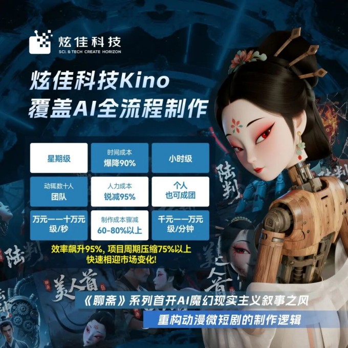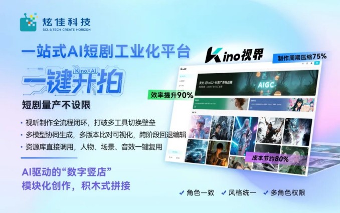 “个人+AI”就能量产爆款微短剧,已经成为现实。南京炫佳网络科技有限公司(下称“炫佳科技”)是专注“AI+视听科技”领域的国家高新技术企业,炫佳科技商务经理潘文汇表示,“我们始终相信技术能重构创作边界,我们研发的Kino-AIGC平台不仅实现了核心技术自主可控,更把内容生产从‘慢工细活’变成了‘高效精准’,比如之前服务的文旅项目,用AI把静态景区介绍变成动态短片,传播效果提升了3倍。”
